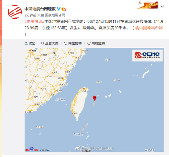 台湾花莲县海域发生4 1级地震 震源深度20千米 坤哥热点资讯